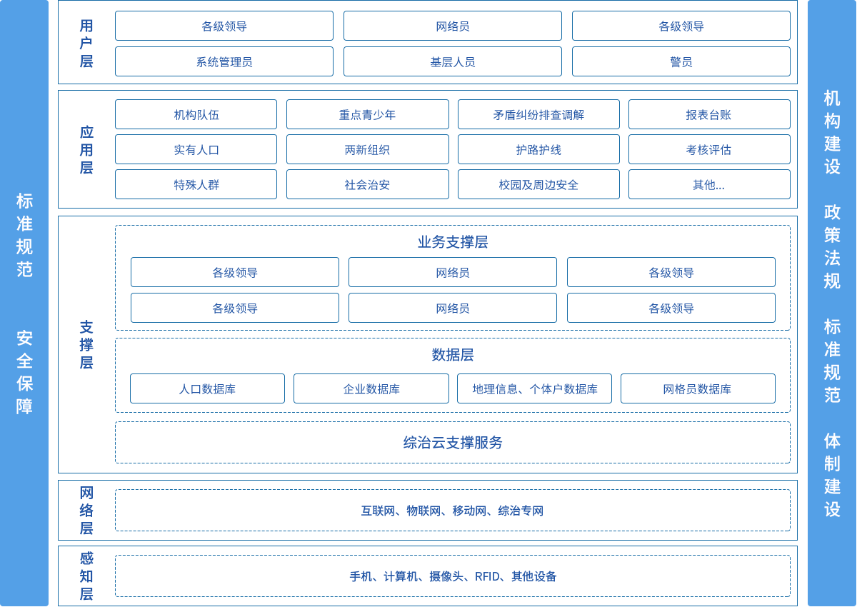 系统采用“9+X”的架构,依据国家标准《社会治安综合治理基础数据规范》(GB/T31000-2015)的要求,系统实现综治组织及综合业务管理、实有人口服务管理、特殊人群服务管理、预防青少年违法犯罪、非公有制经济组织和社会组织服务管理、社会治安防控、矛盾纠纷排查化解、校园及周边治安综合治理、护路护线联防等相关业务应用。系统可根据业务需要进行个性化定制和扩展延伸。